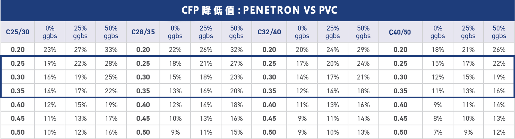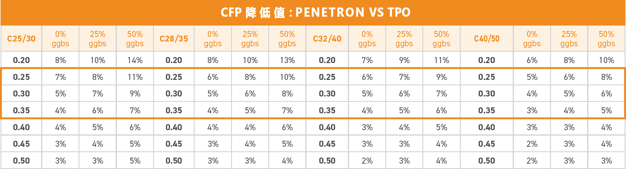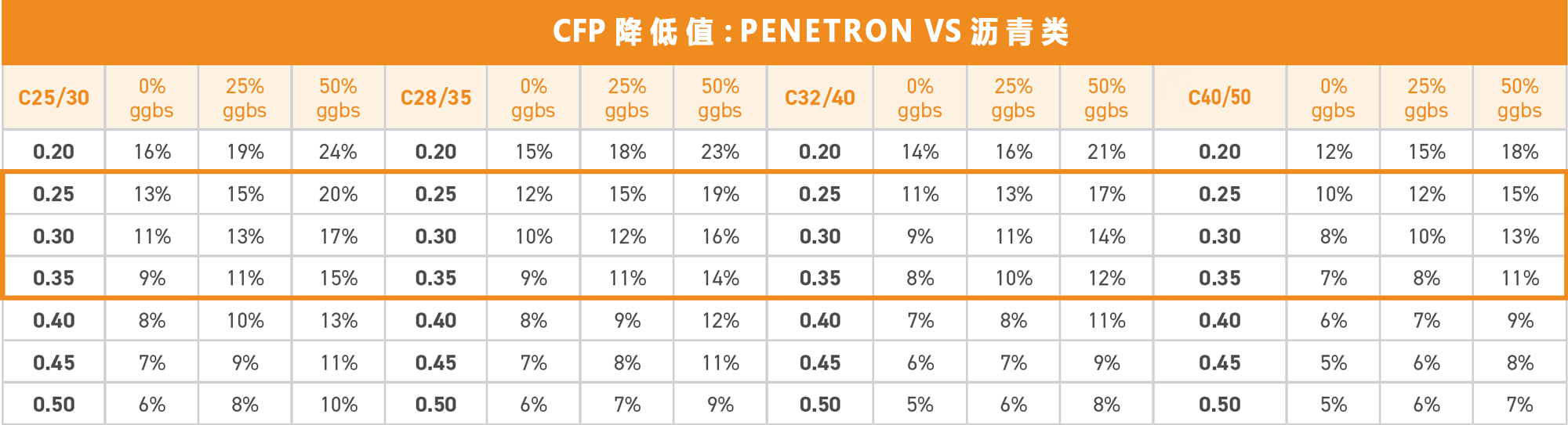 按照結(jié)構(gòu)平均厚度0.25-0.35m計(jì)算每平方米混凝土的CFP,將PENETRON ADMIX 澎內(nèi)傳混凝土防水添加劑(PNC803)與上述表面處理方案進(jìn)行比較?,結(jié)果見(jiàn)右表。